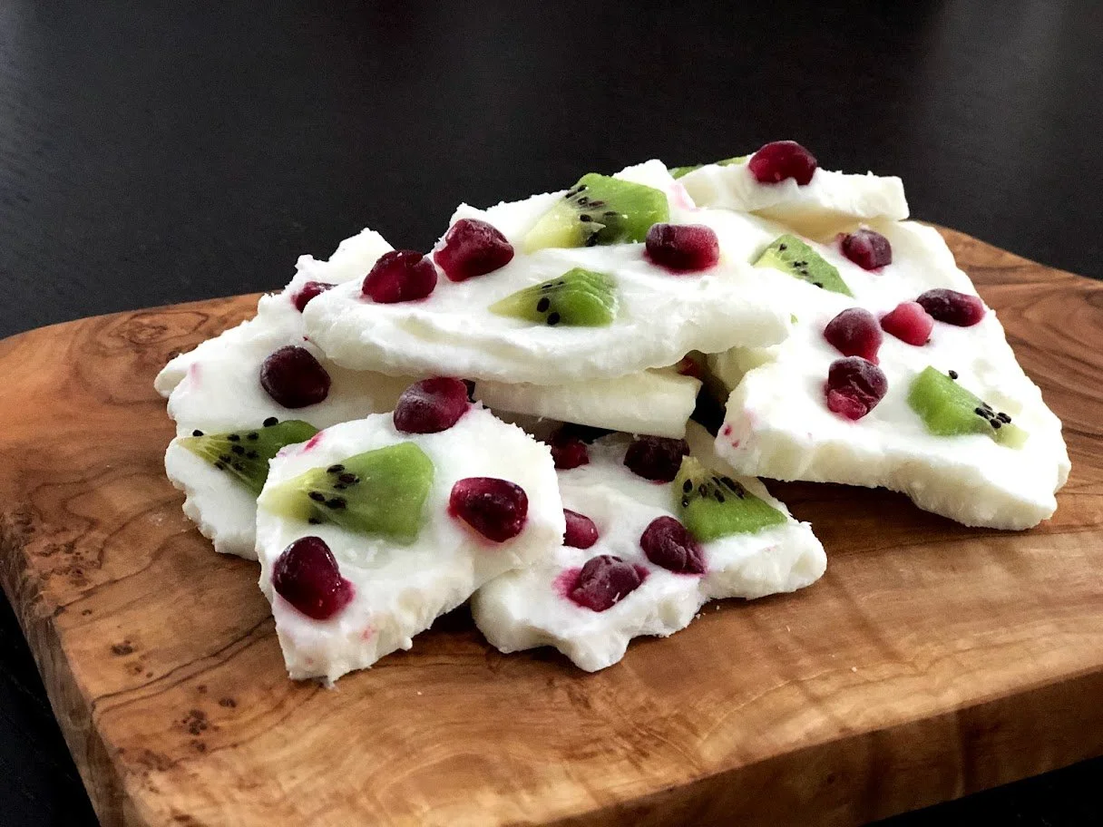 White frozen yogurt bark with kiwi and pomegranate seeds on a wooden board